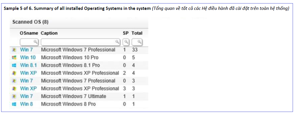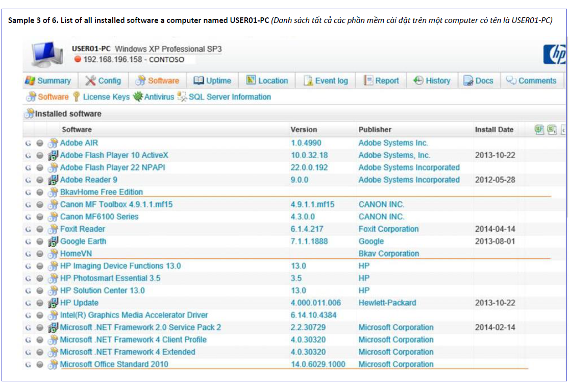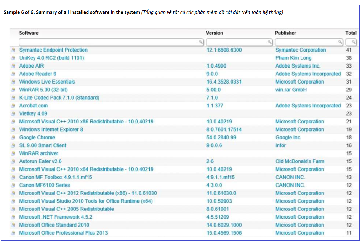 Ví dụ minh họa về báo cáo tổng hợp thống kê thông tin phần cứng/phần mềm trên các máy tính.